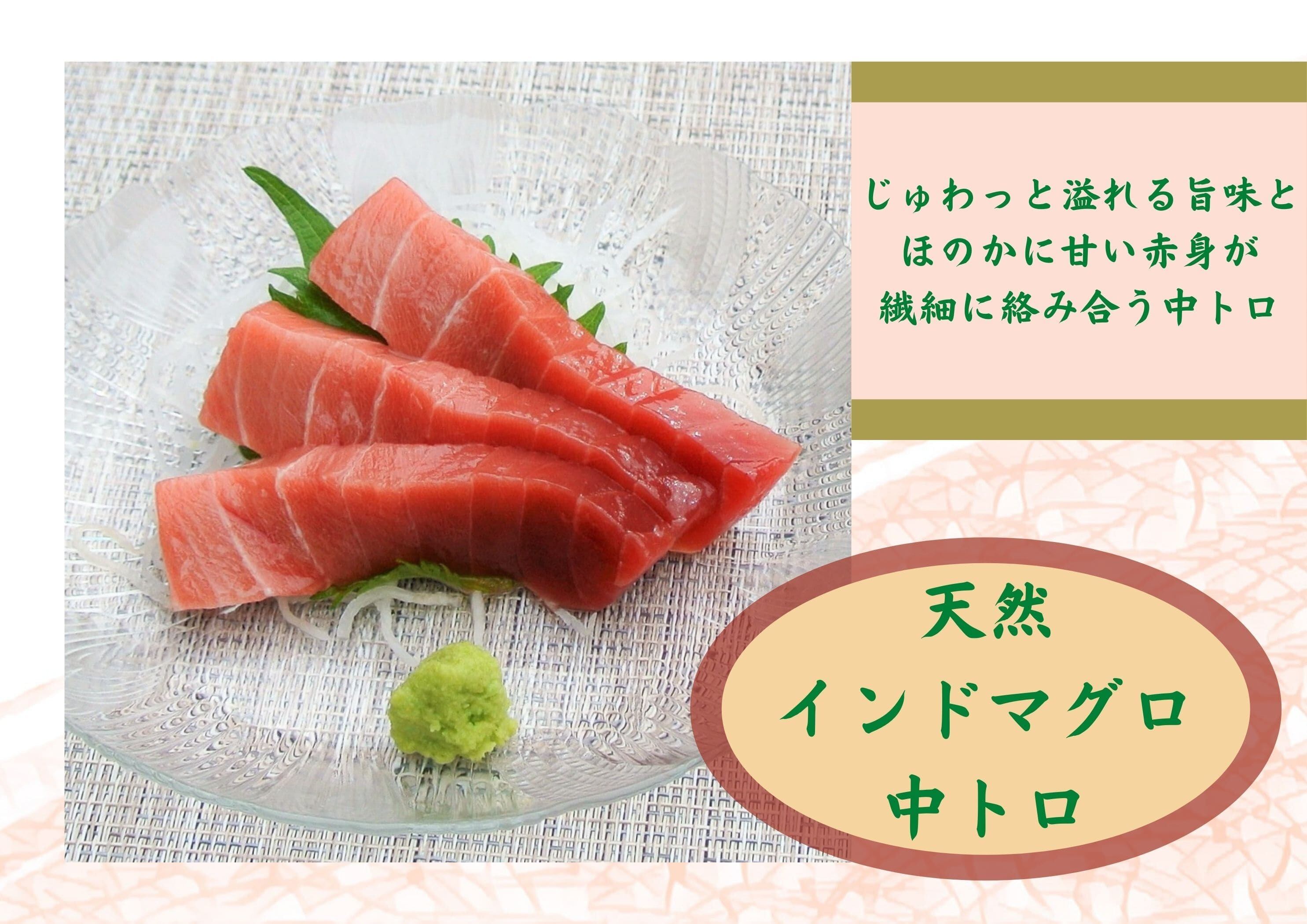 ●天然インドマグロの脂は、あらゆる種類のまぐろの中でも、甘く繊細な舌触りで、まぐろを知り尽くした美食家の中でも好まれています。そんな上質な脂と赤身がほどよく混じったインドマグロの中トロ。キメ細やかで贅沢なハーモニーをお楽しみ下さい。約半世紀に渡り、最高のまぐろを追い求めた店主がお勧め致します。